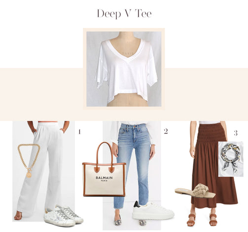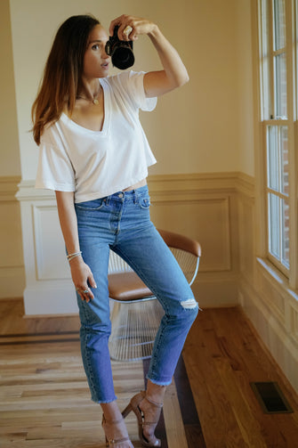 When a standard t-shirt will not do, this cropped modal V Neck tee is soft, and wears great with a high waisted skirt or jeans.