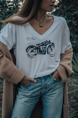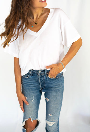 Every girl needs a flattering t-shirt for her wardrobe— hits at the hip, v-neck, and incredibly soft.Shalice is wearing a size small.